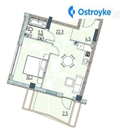 Квартира с рациональной планировкой, комната прямоугольной формы, кухня с зоной отдыха и выходом на балкон.