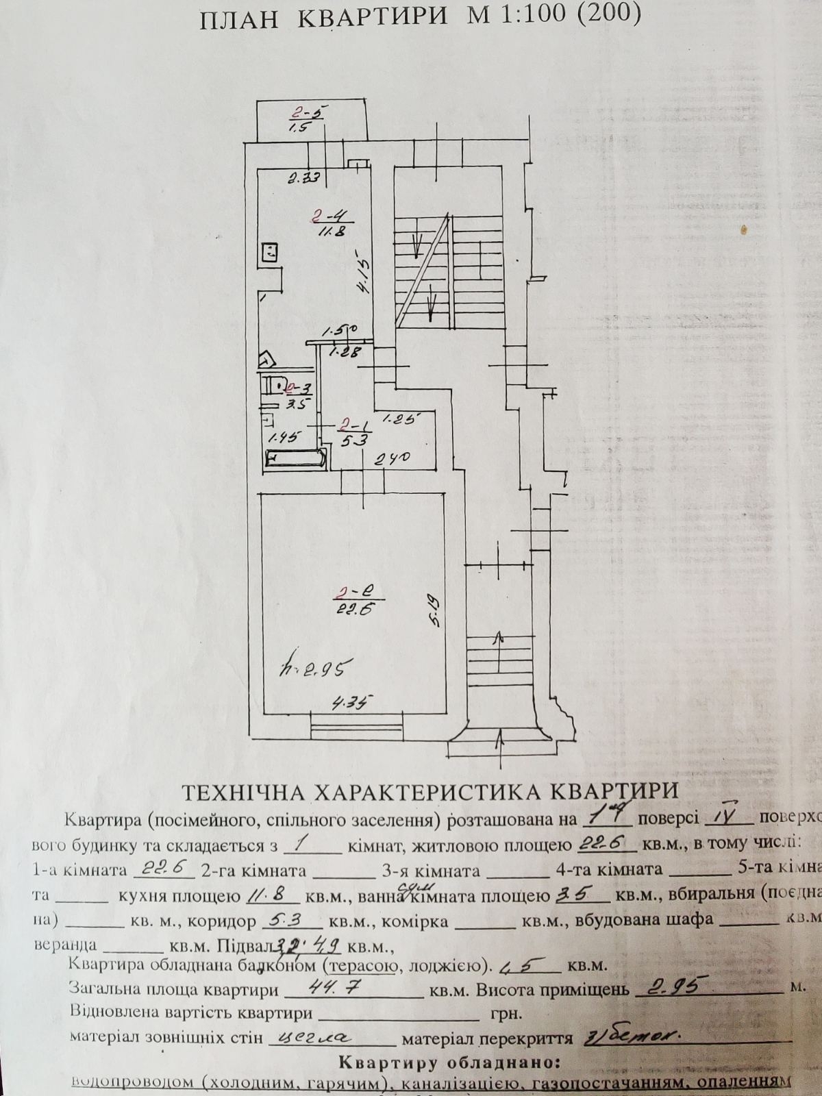 Поверх: 1/4 цегла (Польський люкс), залізобетонне перекриття, висота 2.95м.