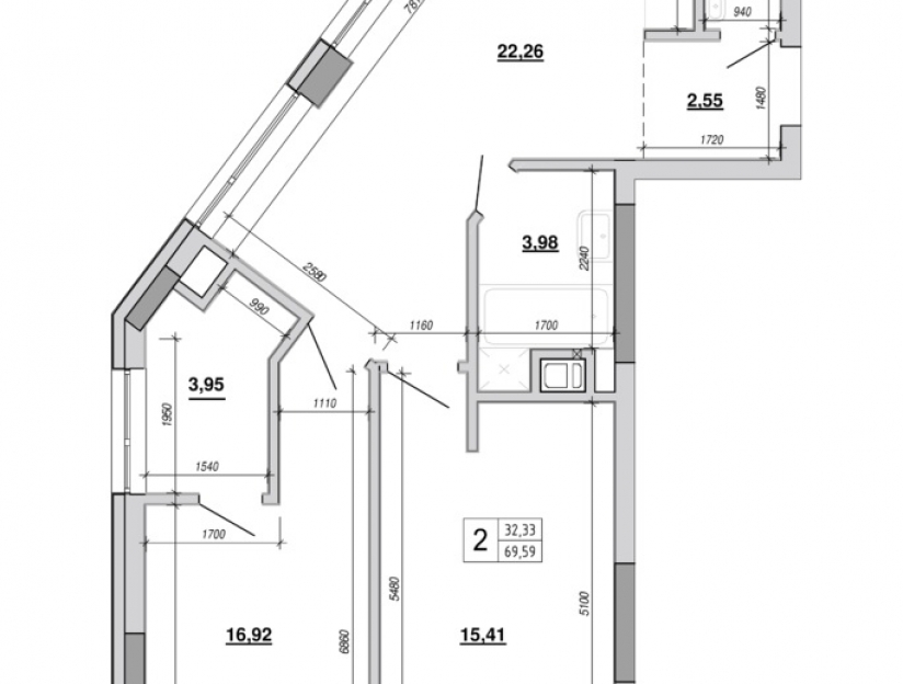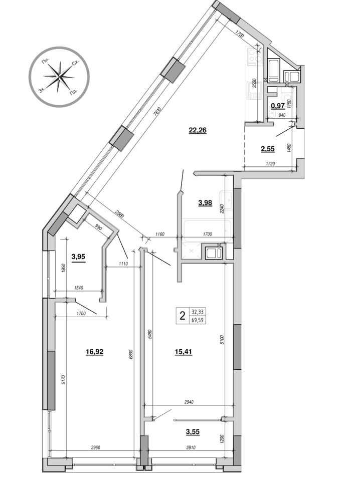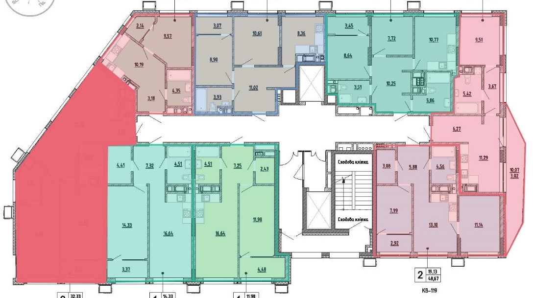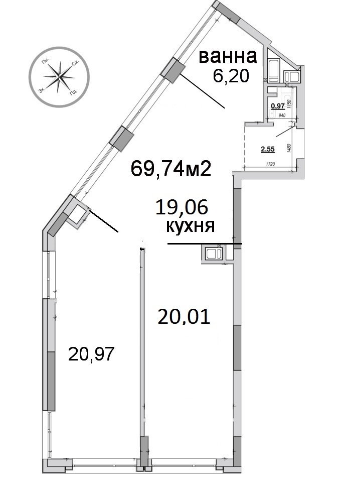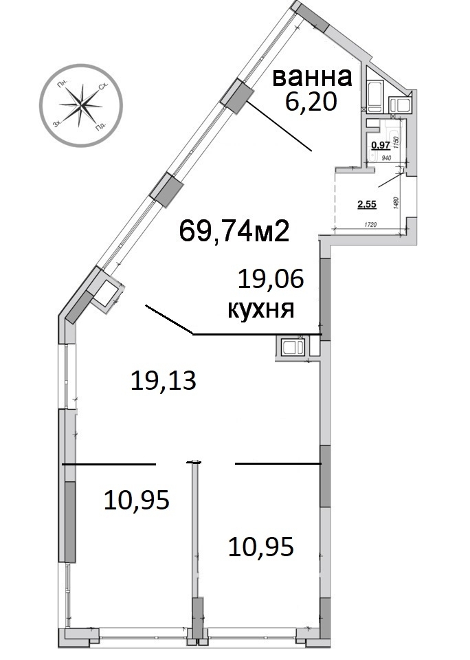 * Багато вікон - можливе різне планування - або 2 великі кімнати 20м2 та 21м2
