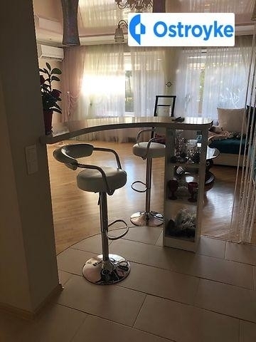 Вітальня-29, 2 кв.м., великі вікна, кондиціонер Electrolux Inverter, батареї, натяжна стеля, шпалери німецького виробництва, фотошпалери, паркет-дуб. Вітальня розділена з кухнею барною стійкою.